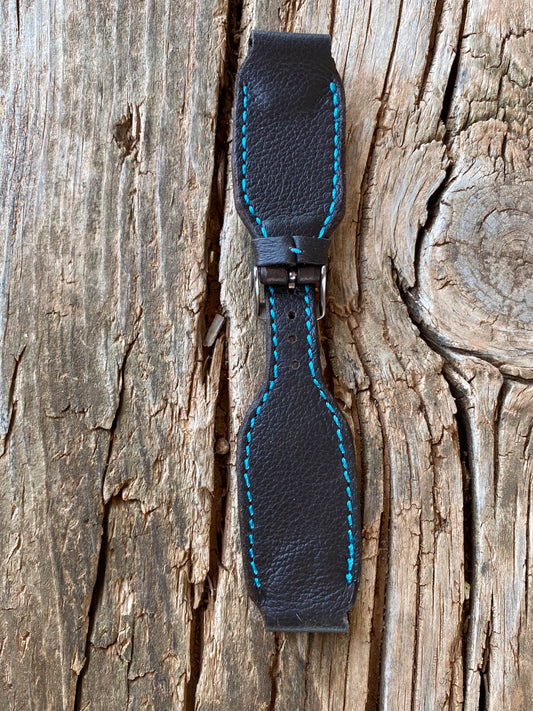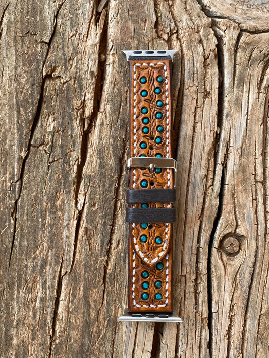 Dark Brown and Natural Tooled Watchband with Turquoise Stitching