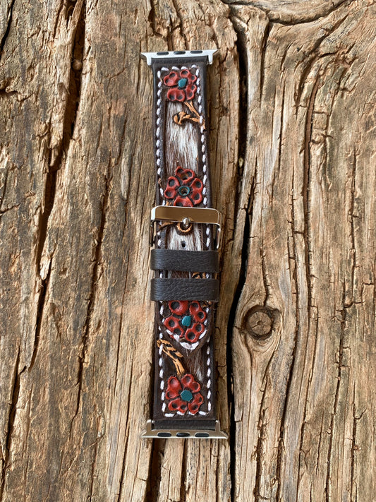 Red and Turquoise Floral Tooled 42/44mm Apple Watchband with Red and White Cowhide Inlay