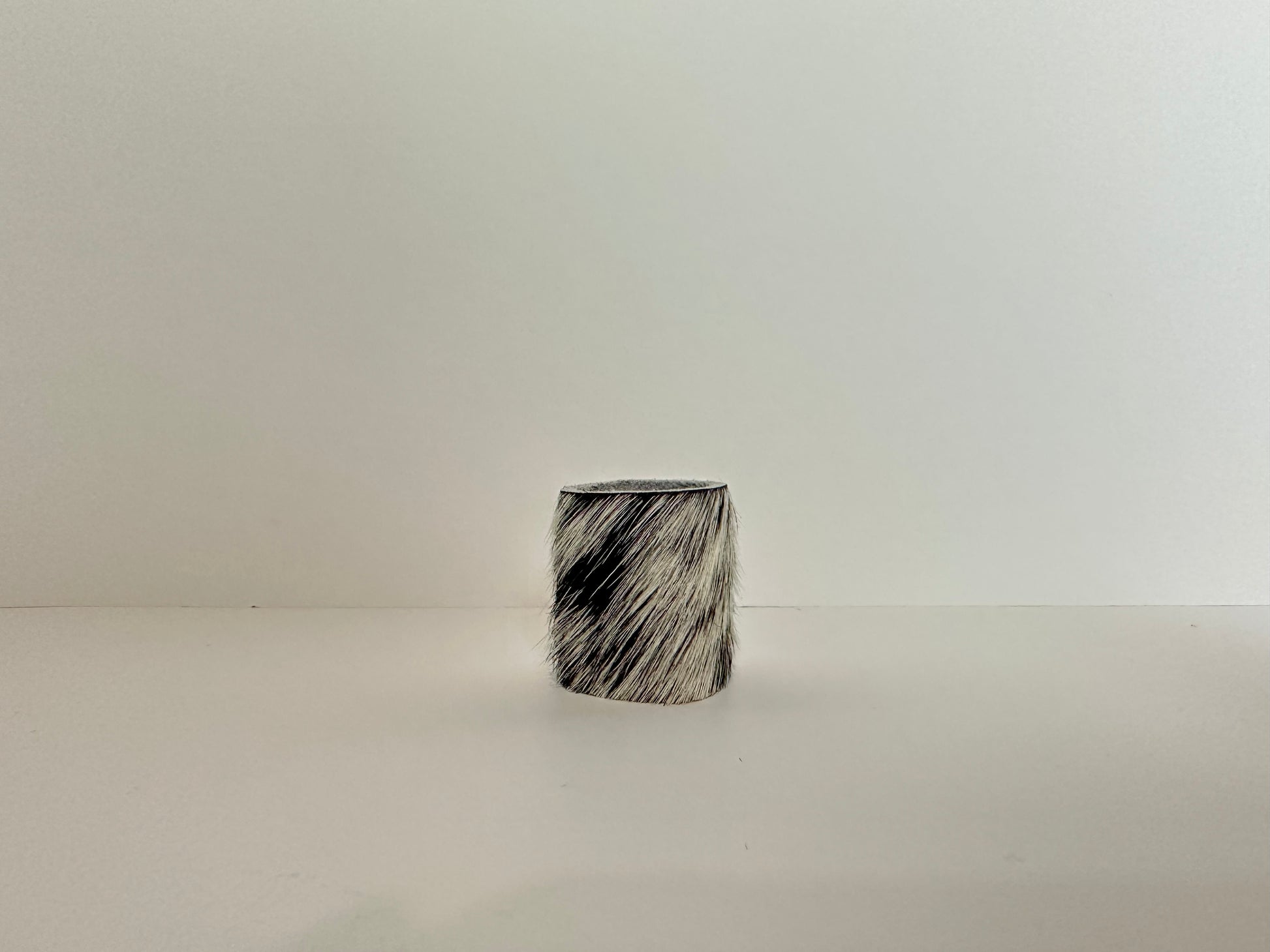 Hair on cowhide wild rag slide hand stitched in the back. These measure 1 1/4” tall and 3” around. Due to the handmade and natural nature of these products there can be slight variations in color, pattern, and measurement making each unique.