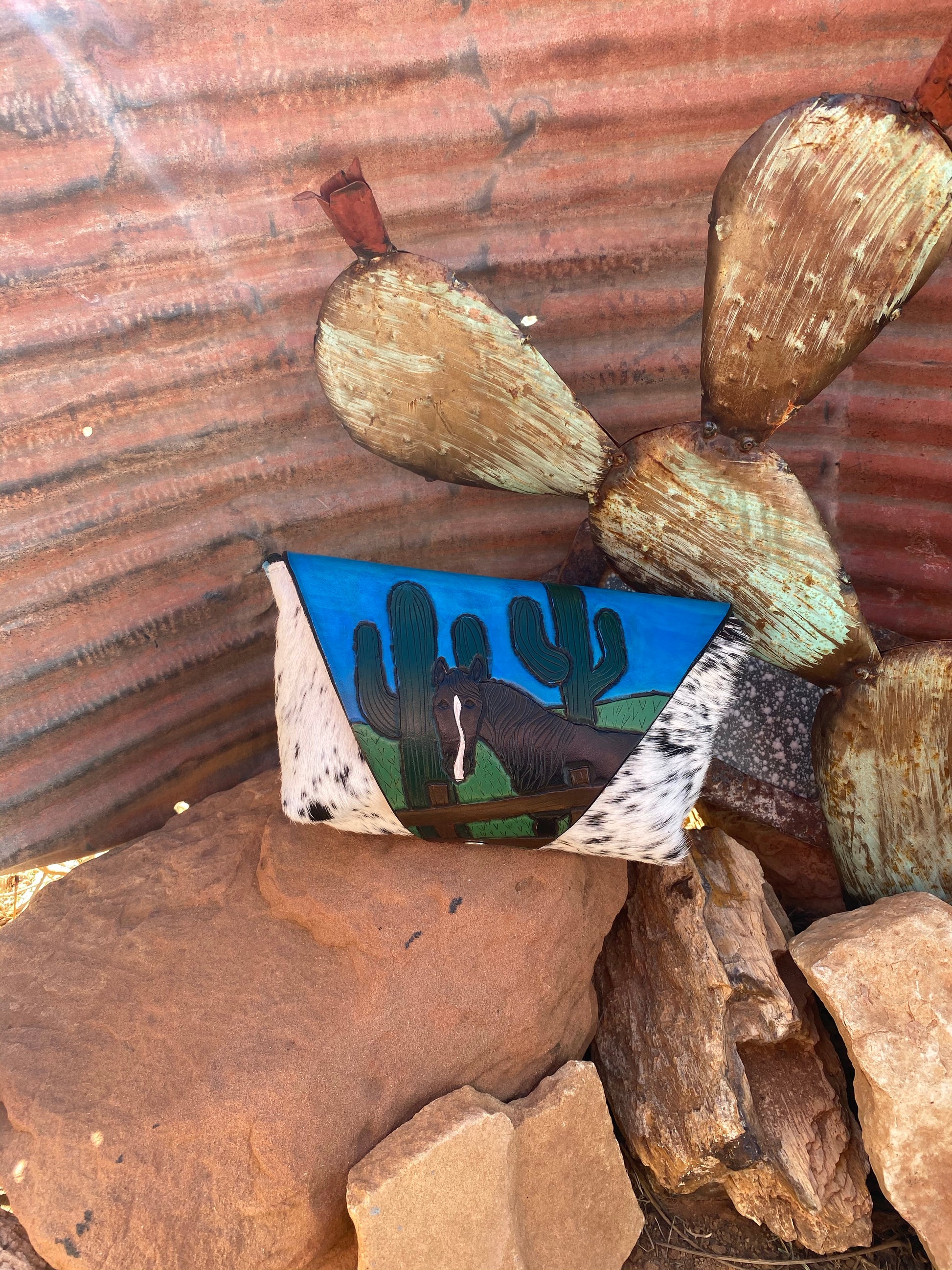 Cowhide Wipe Cover with Black Horse and Cacti Tooled Flap