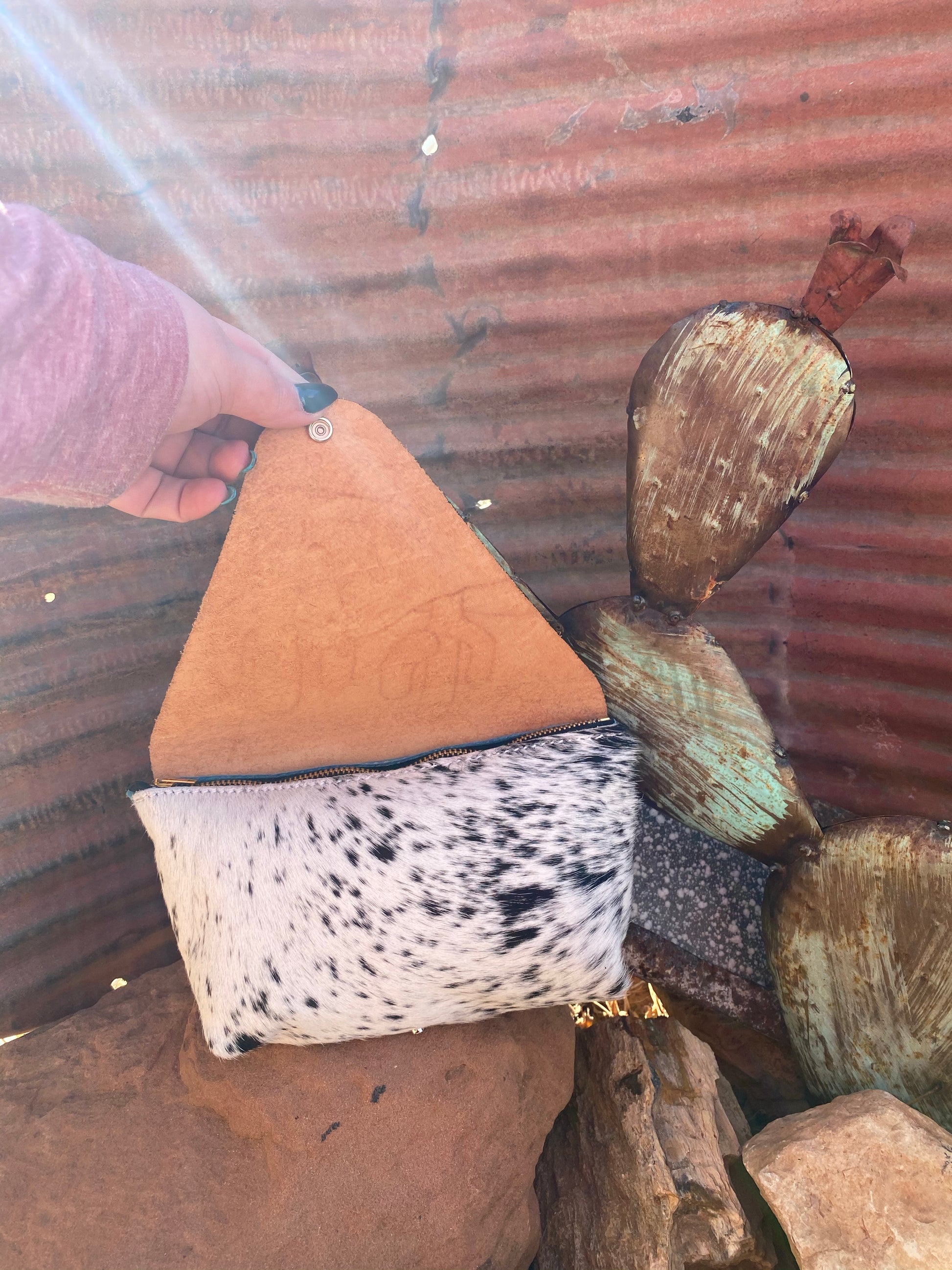 Zippered cowhide wipe cover with tooled flap. This tooled flap features a black horse with a blaze in a pasture with large saguaro cacti.