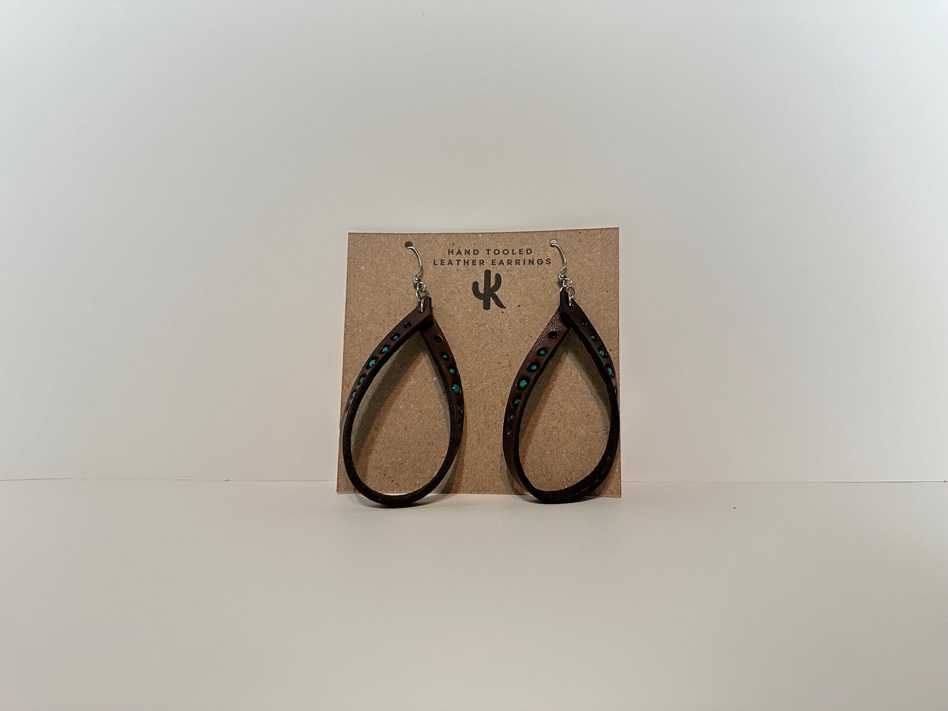 Hand tooled leather earrings. These are available in 3 designs of these lightweight leather earrings Turquoise Spot Tear Loop, Desert Saguaro Sunset Scene, and the Red and Black Dice. Due to the handmade nature of these products there can be slight variations in color, pattern, and measurement making each unique.