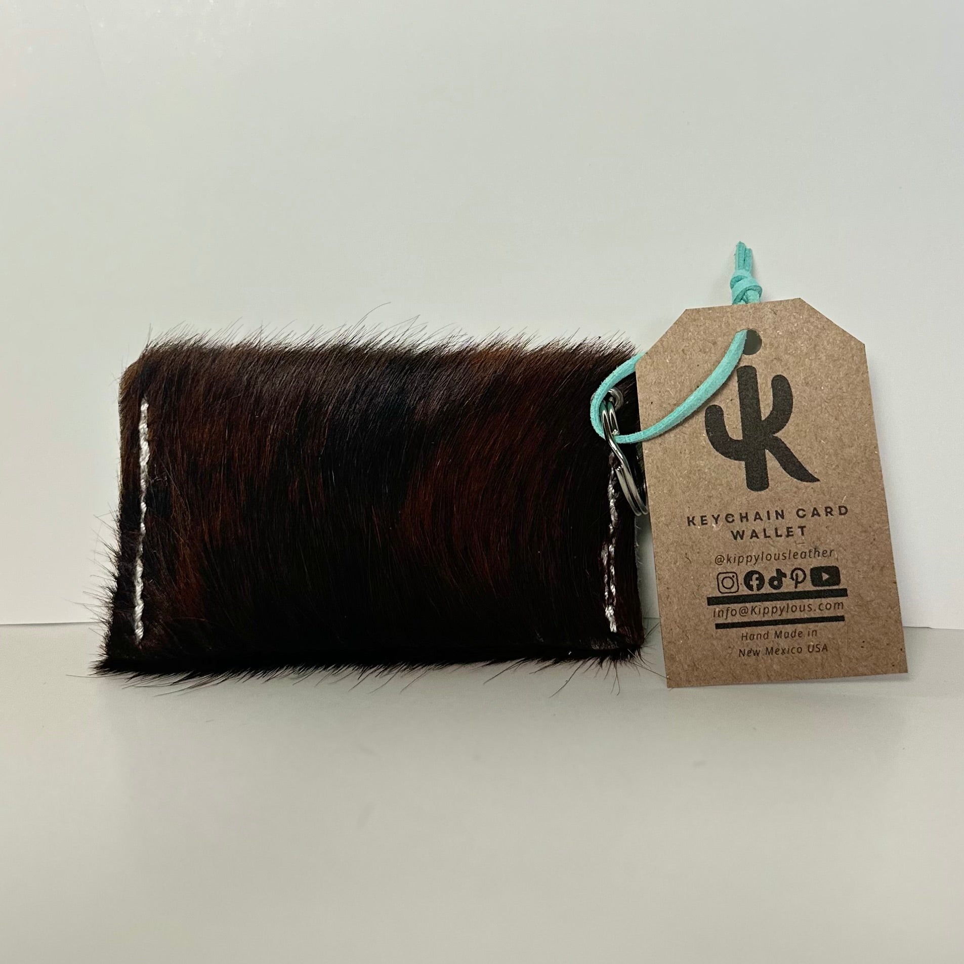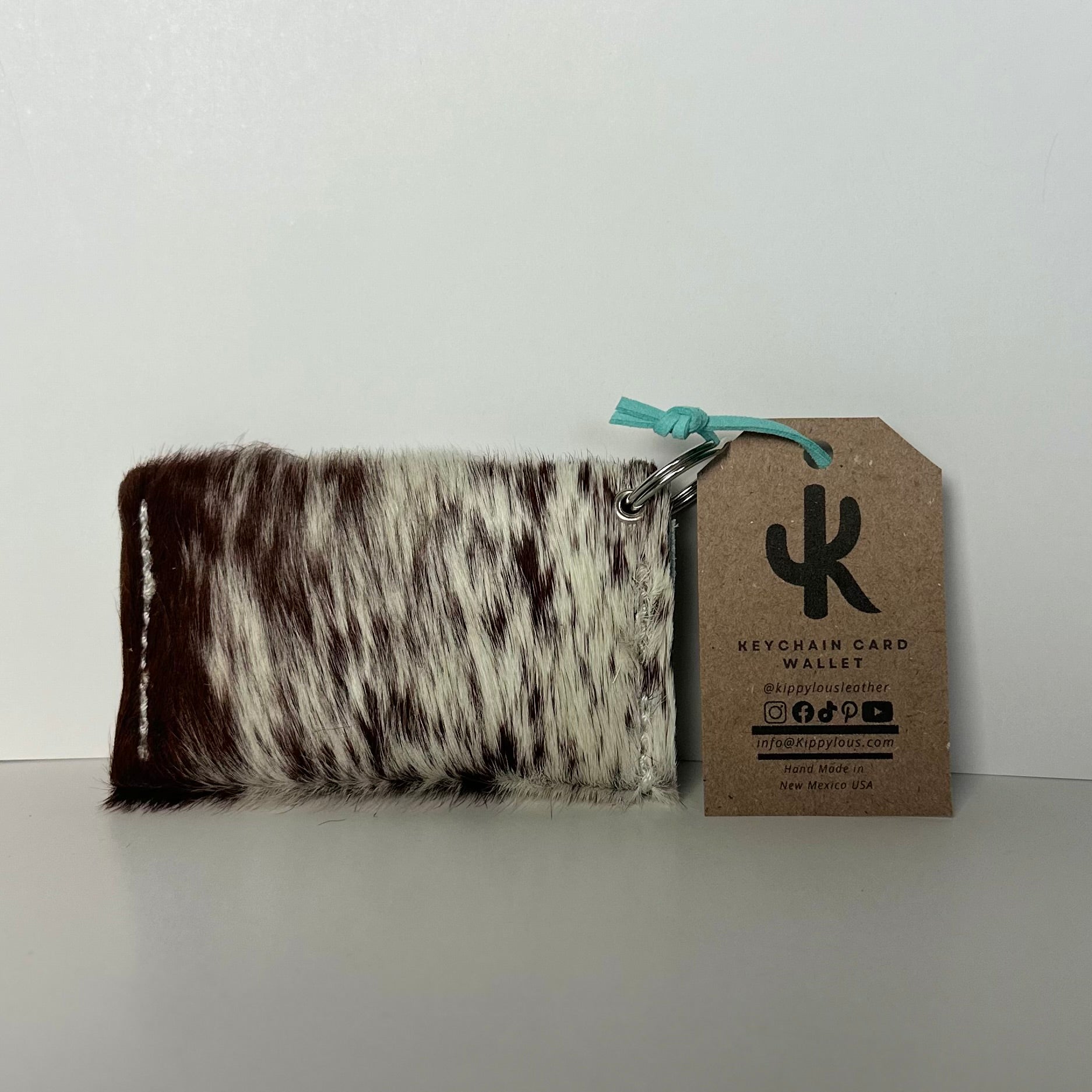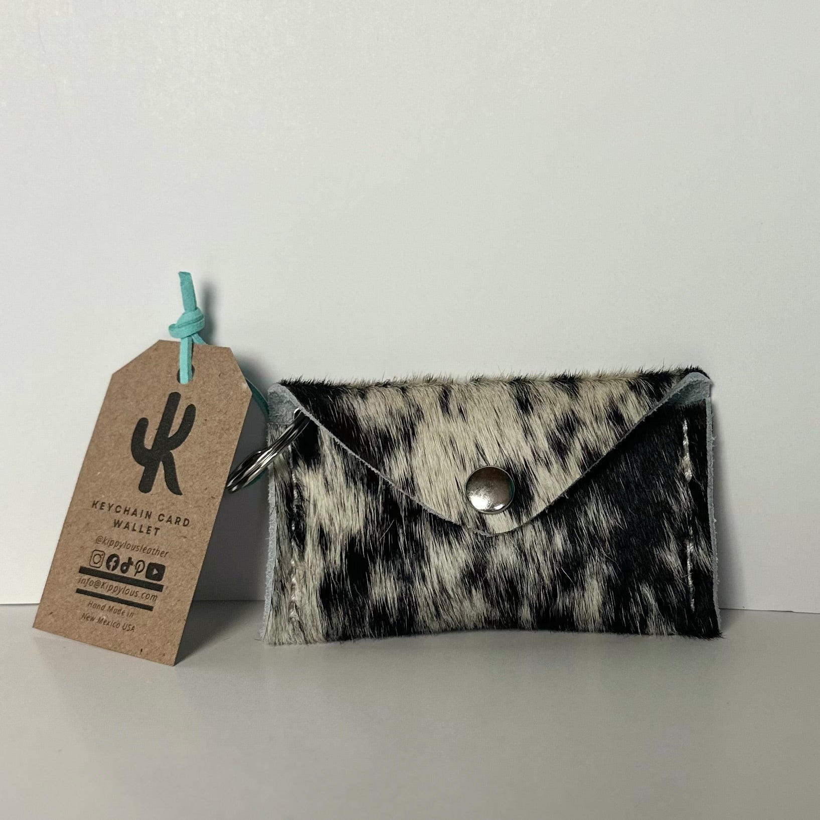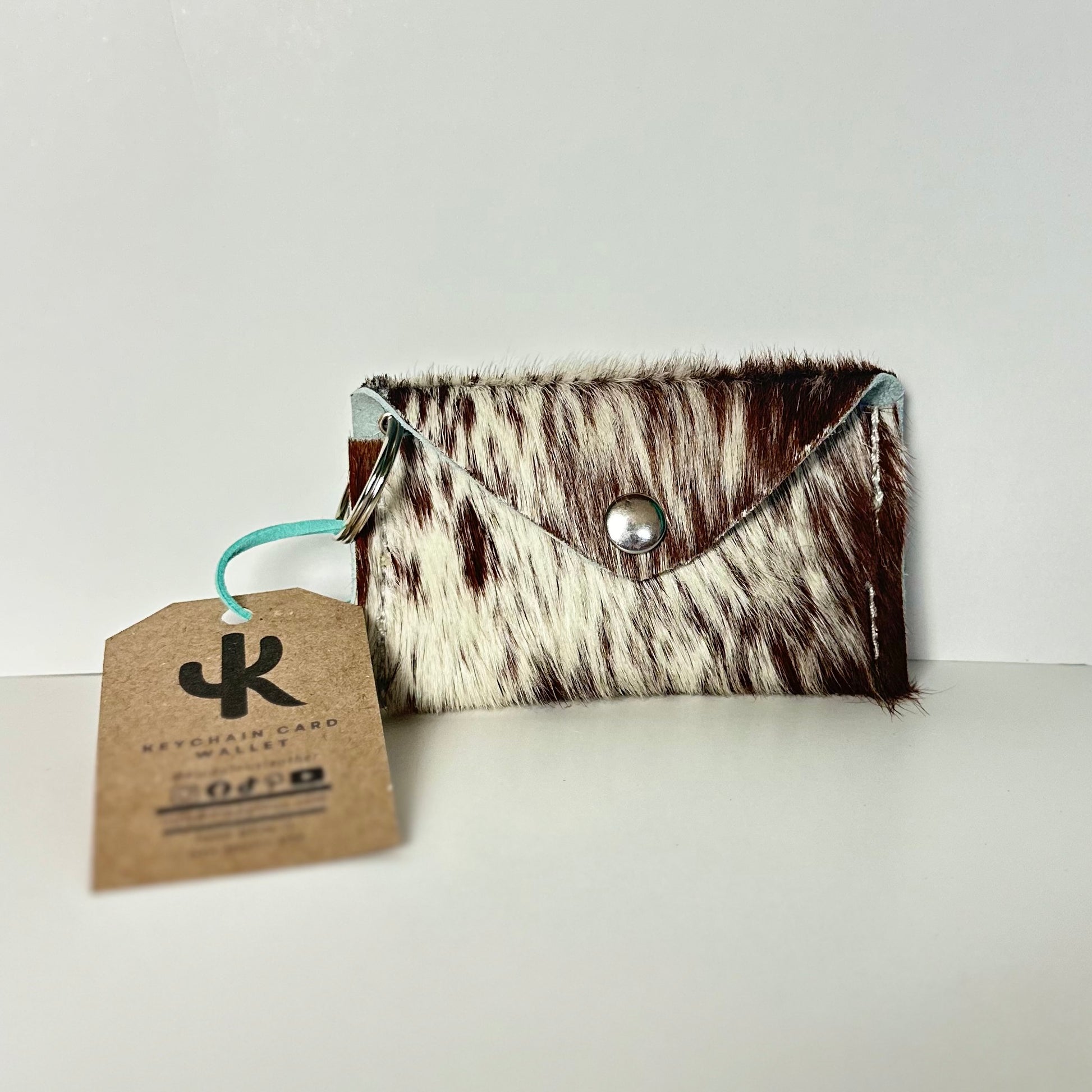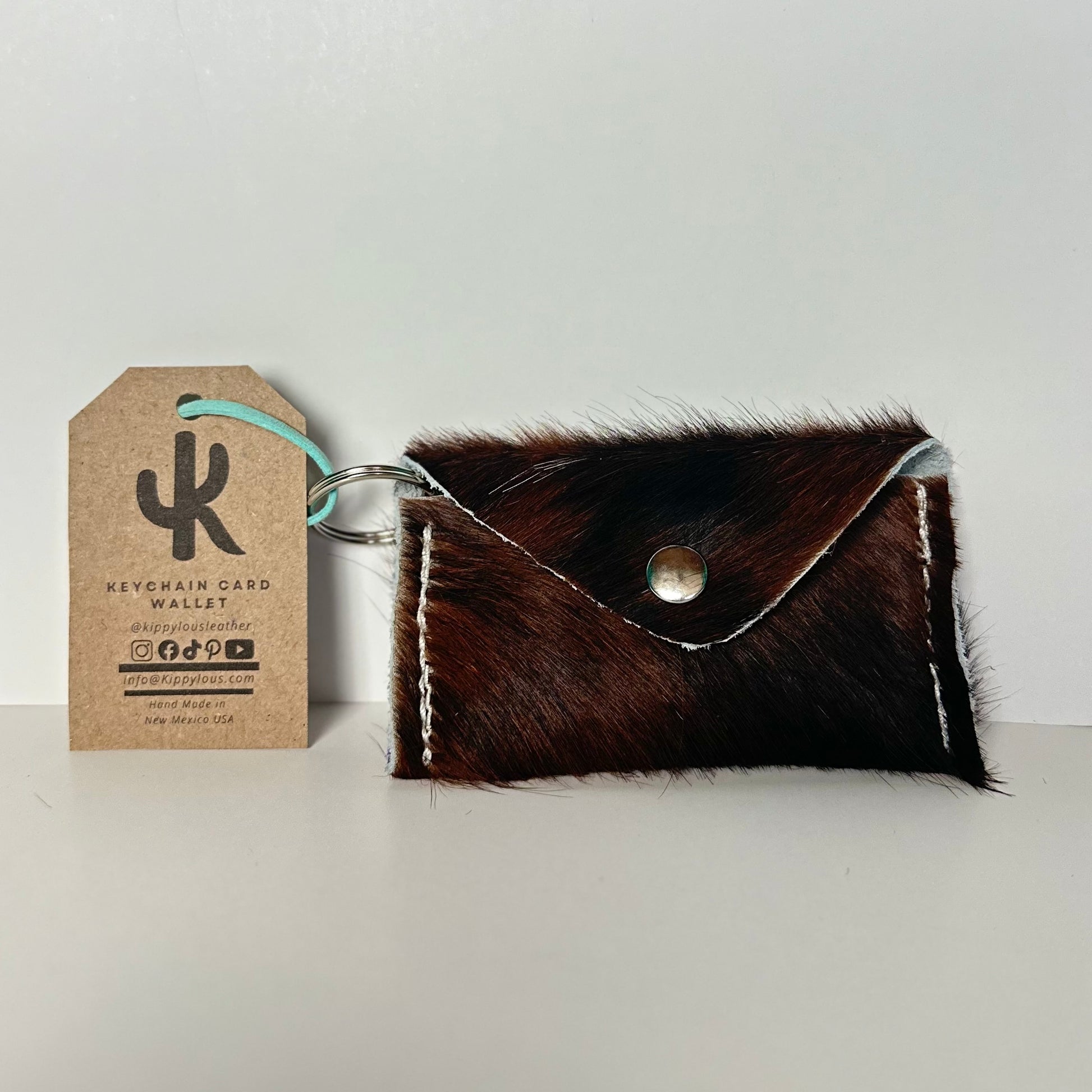 Keychain card wallet with snap closure. Made to carry various cards in and be able to attach to your keys if desired. These come in red and white, black and white, or brindle hair on cowhide. These measure 2 3/4” tall 4 1/2” wide. Due to the handmade and natural nature of these products there can be slight variations in color, pattern, and measurement making each unique.