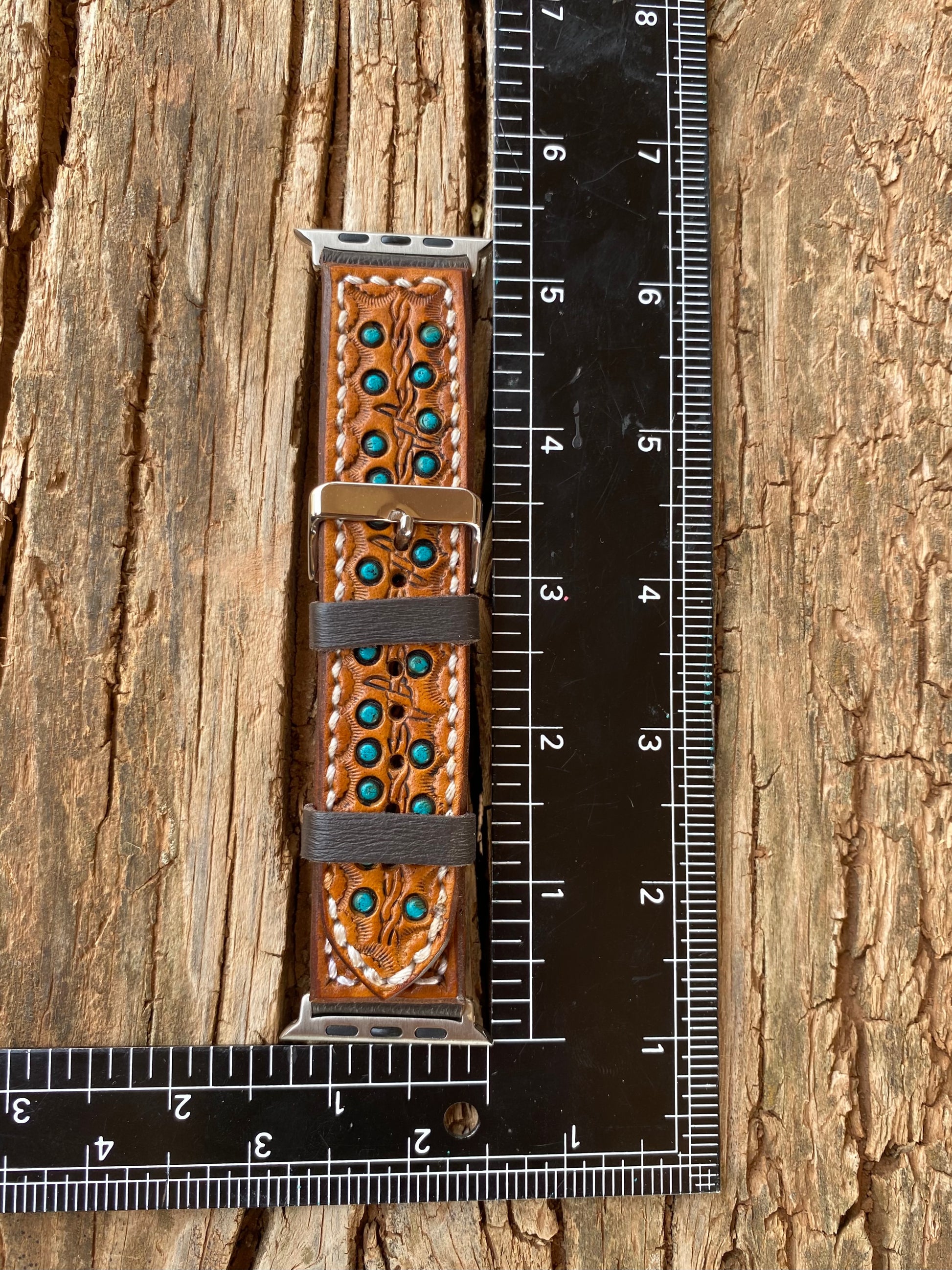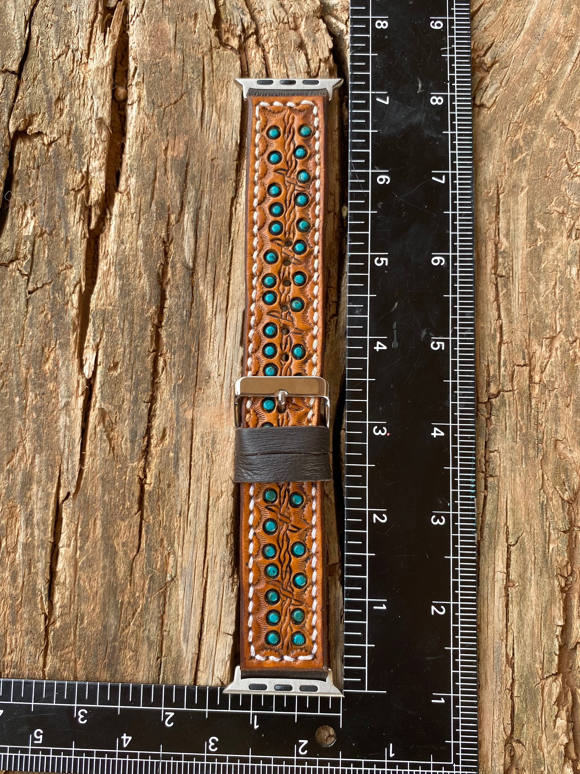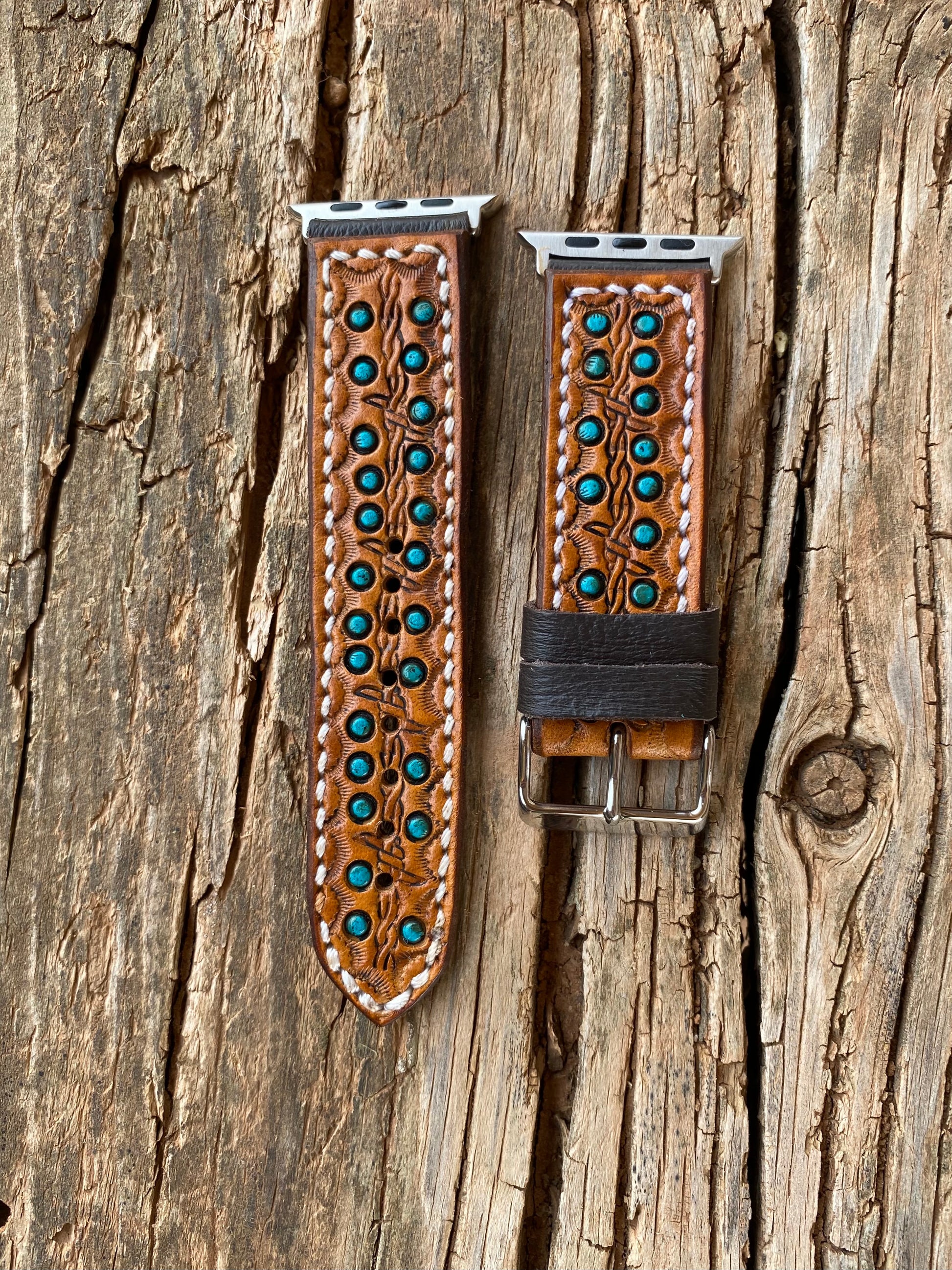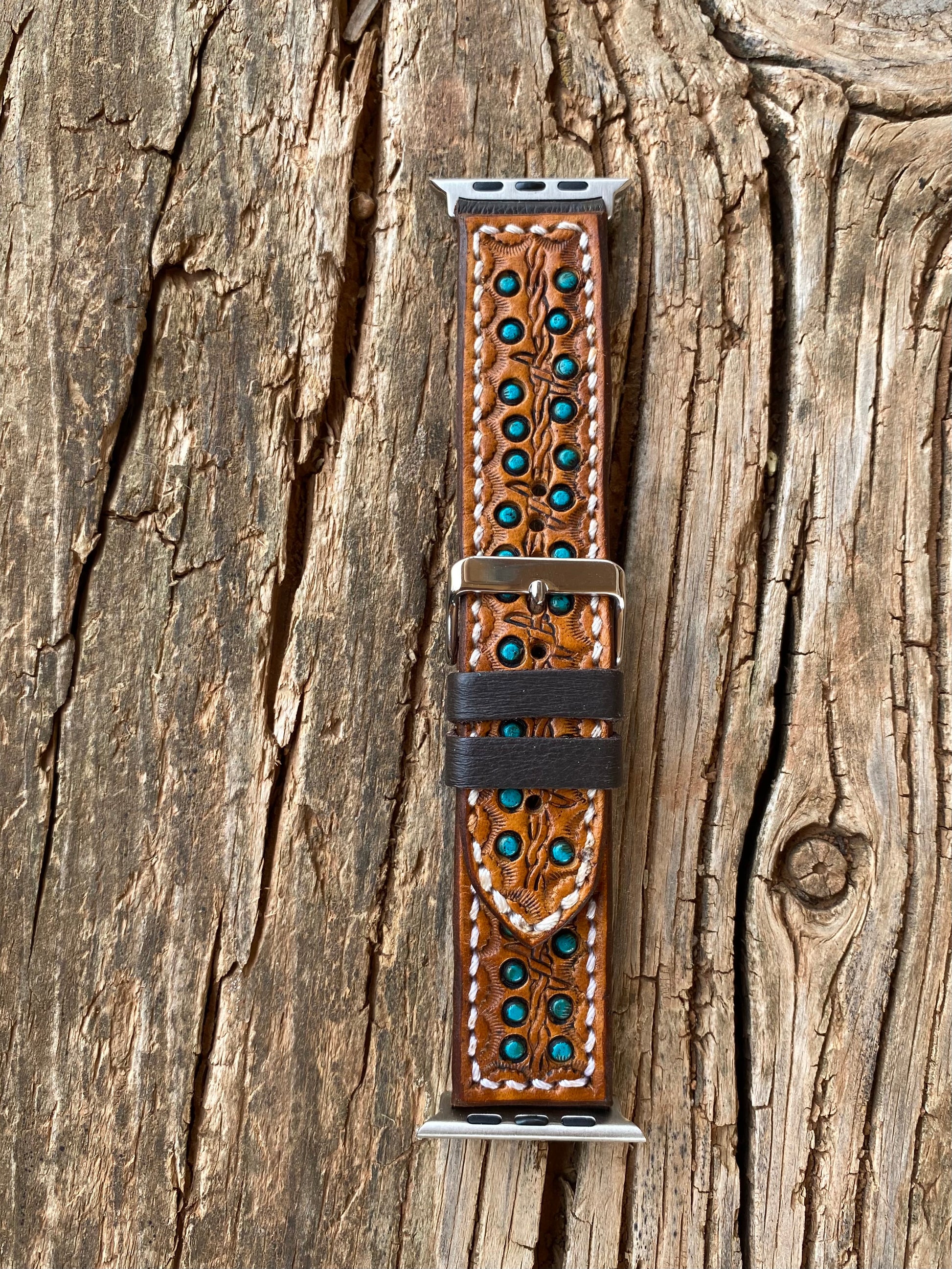 Straight light brown leather watchband featuring turquoise spots and barbed wire stamping.