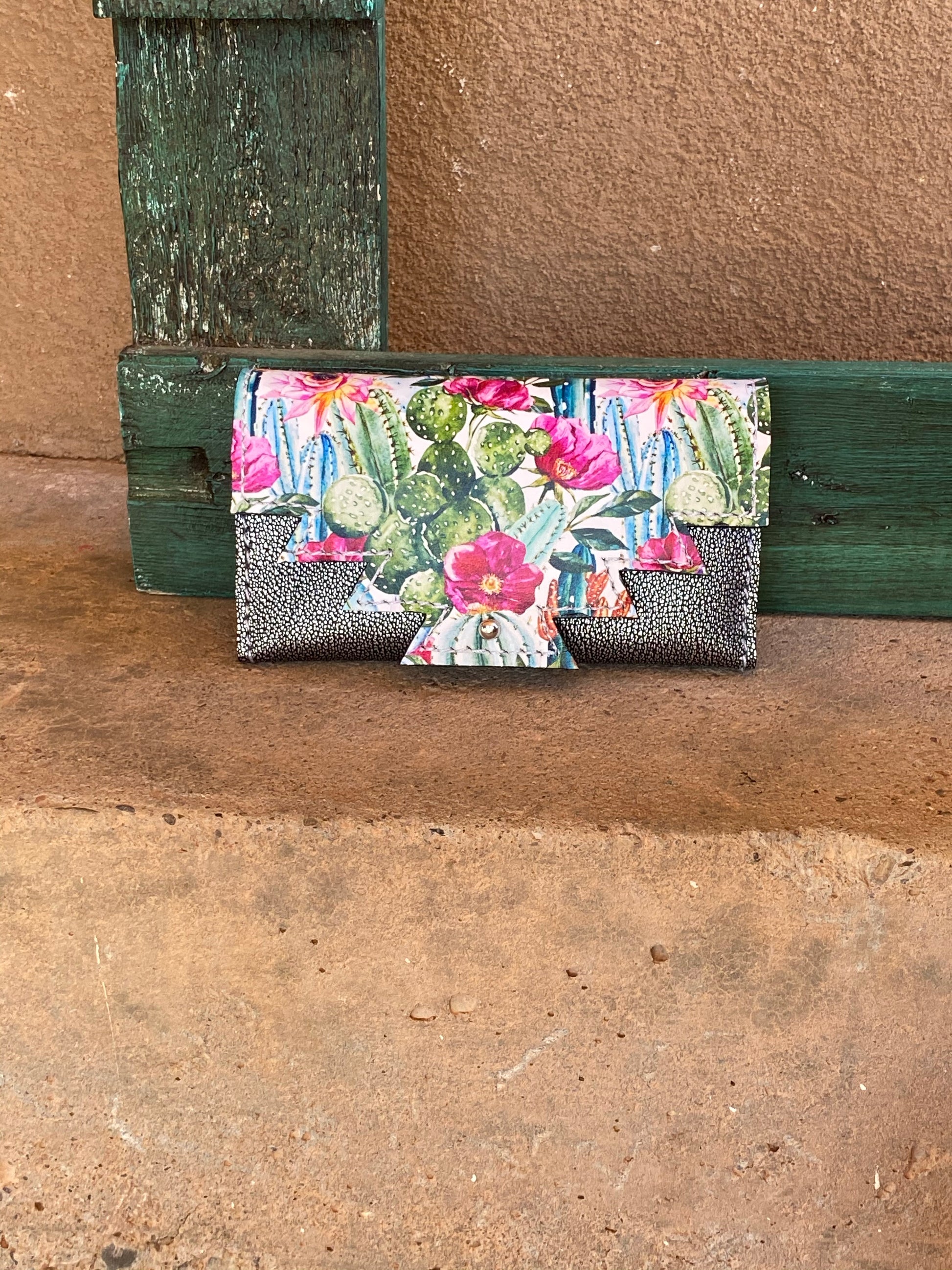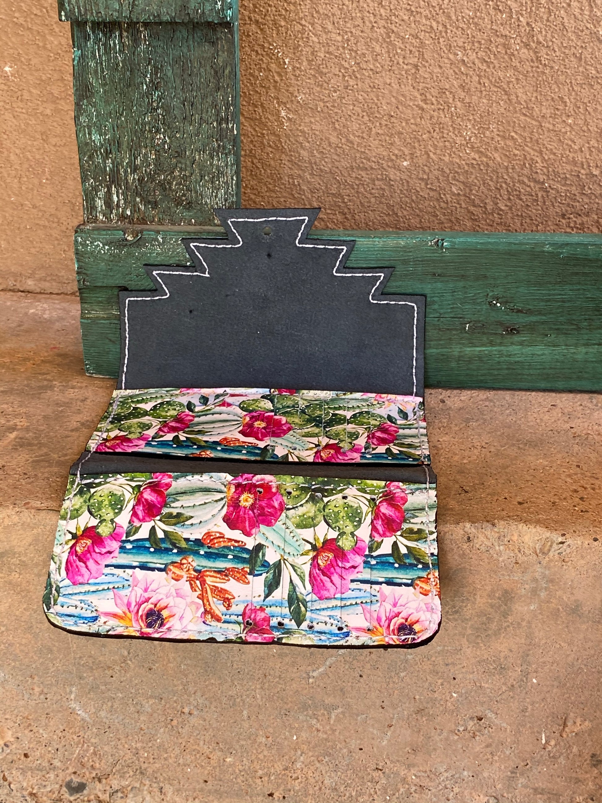 Trifold sliver on black leather wallet with cactus blossom accents.