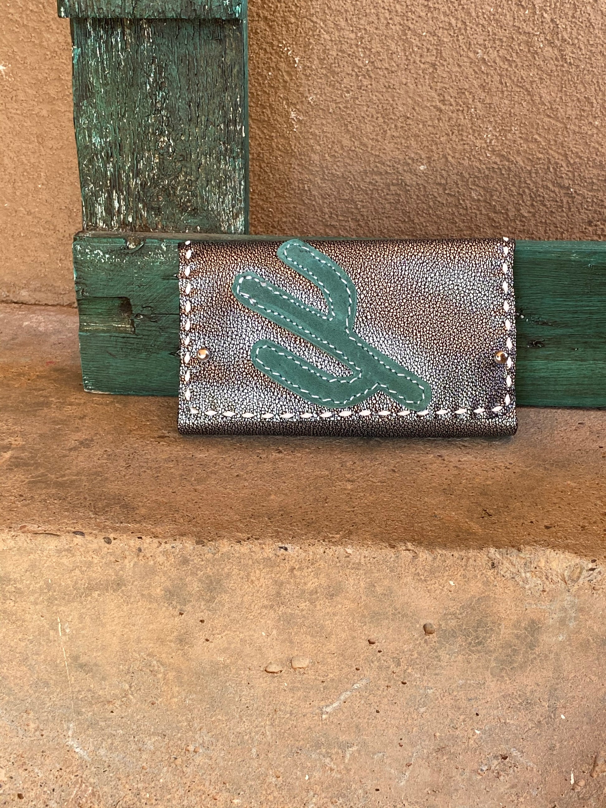 Trifold sliver on black leather wallet with a cactus and teal accents.