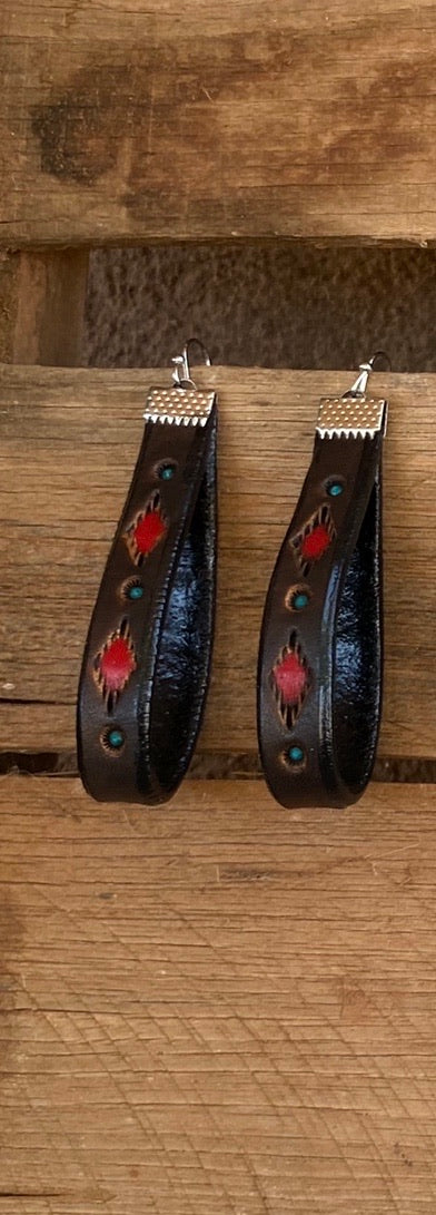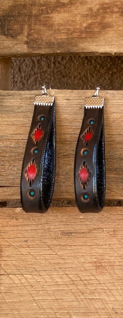 Loop Leather Earrings featuring a southwest look with red and turquoise pops of color.