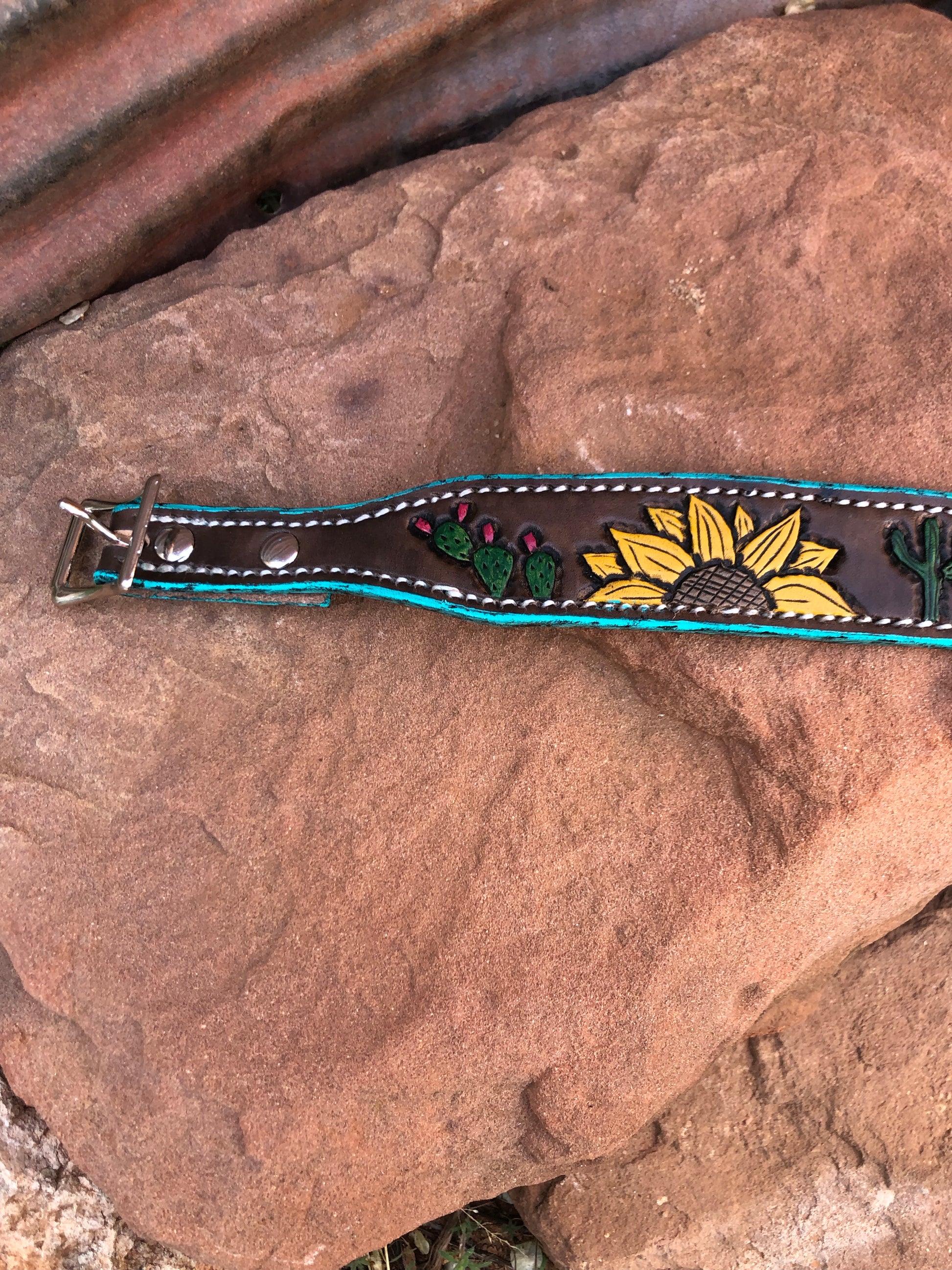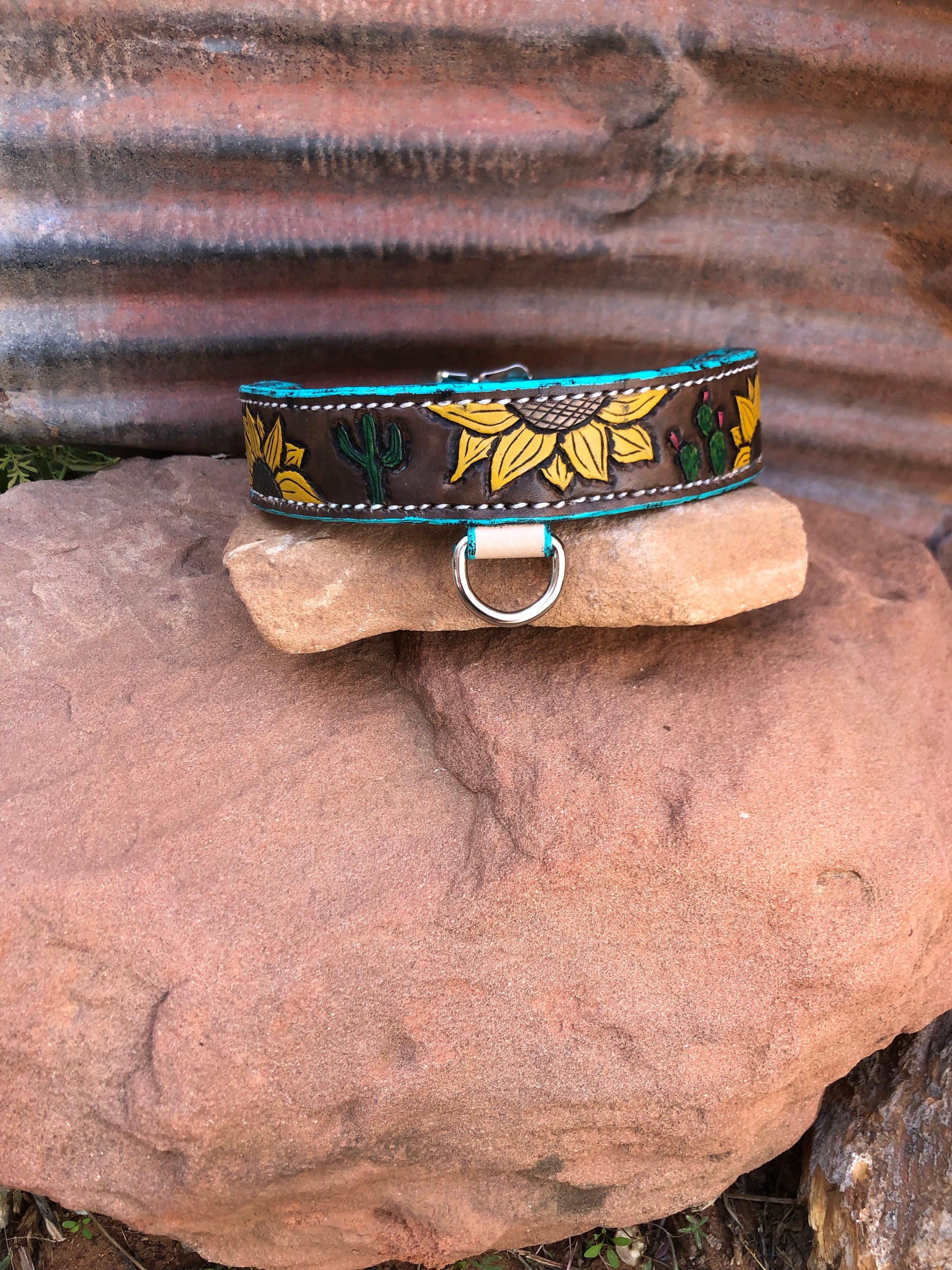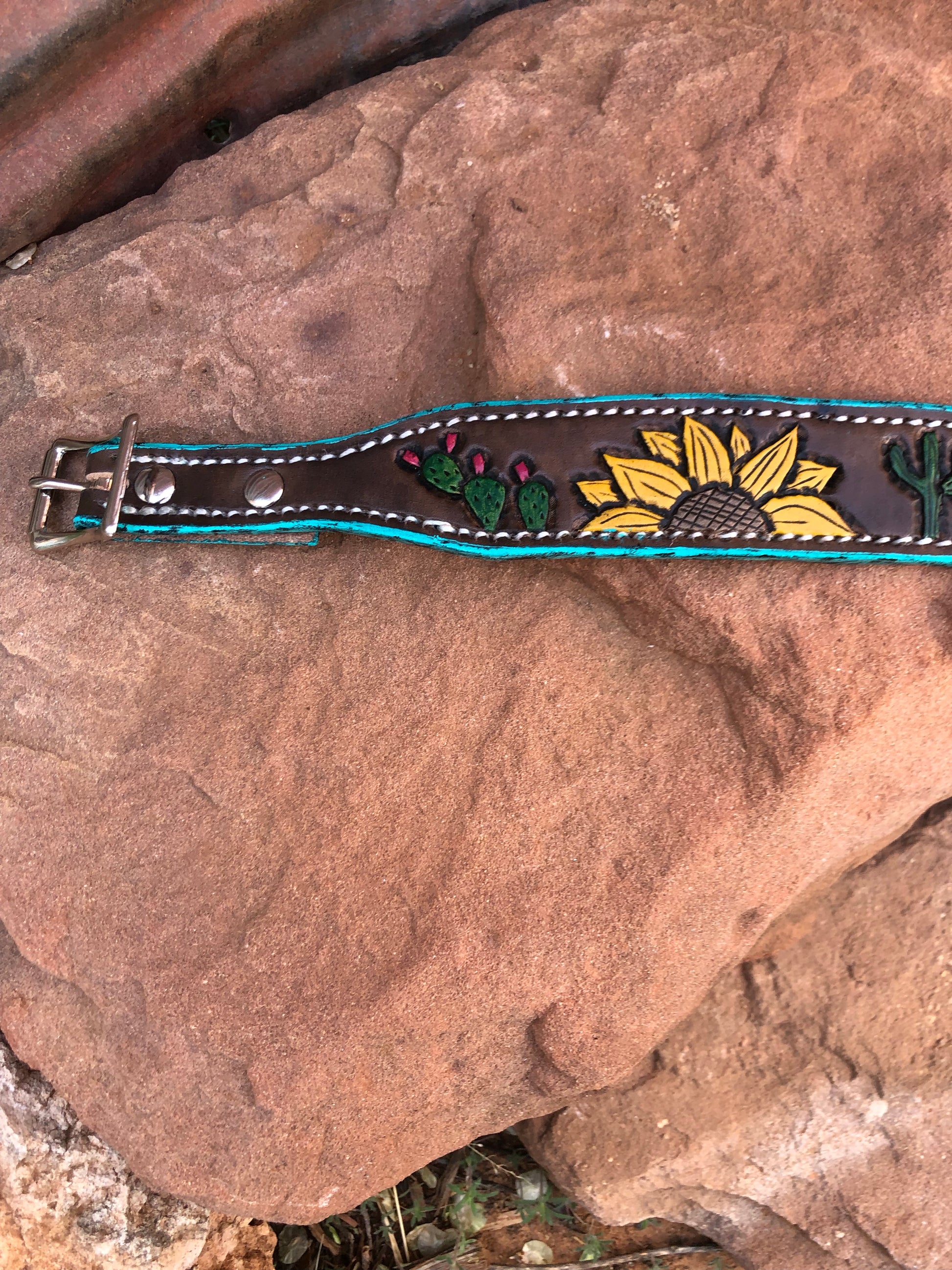 Your pup will look adorable in this cacti and sunflower tooled collar.