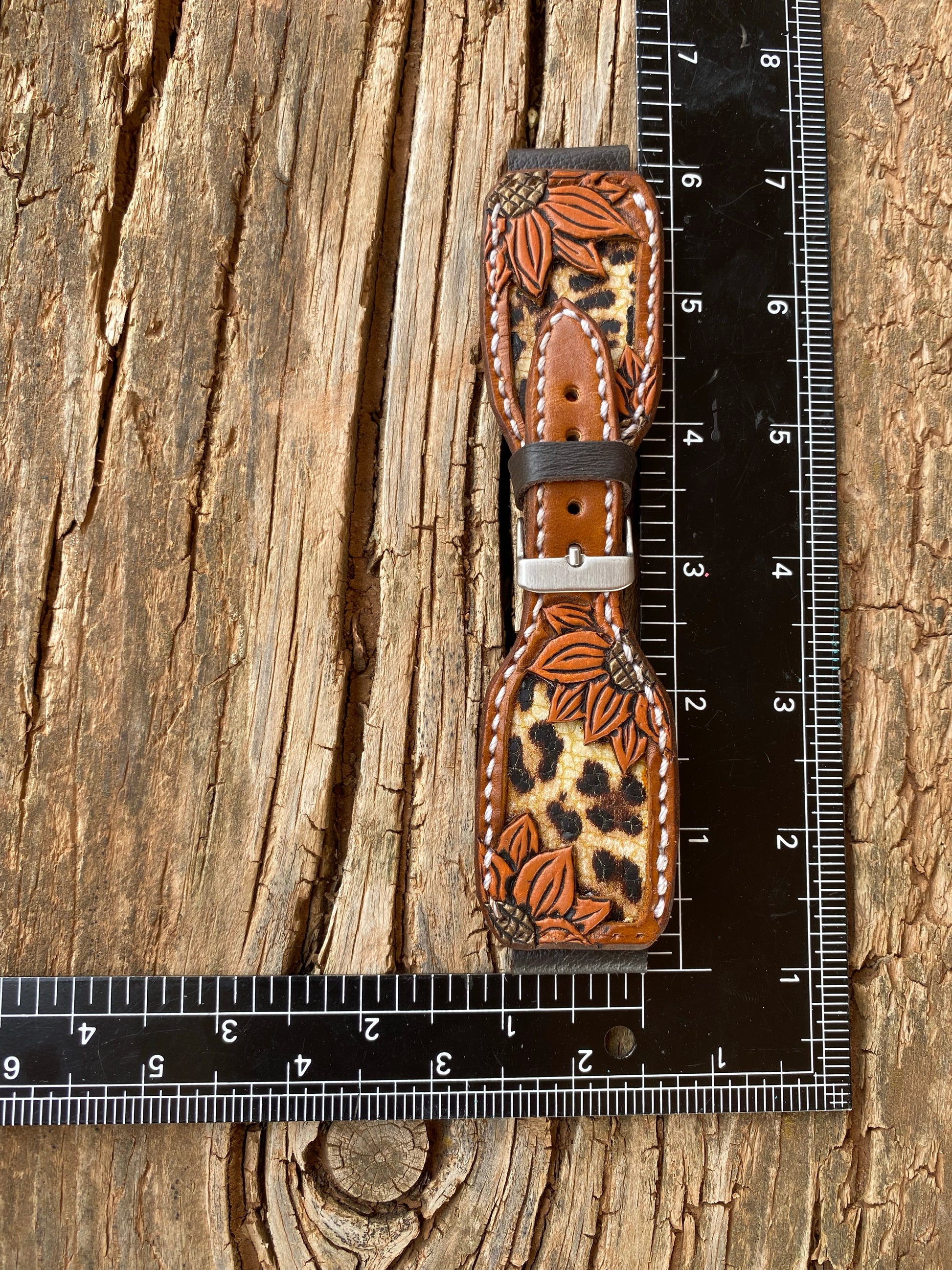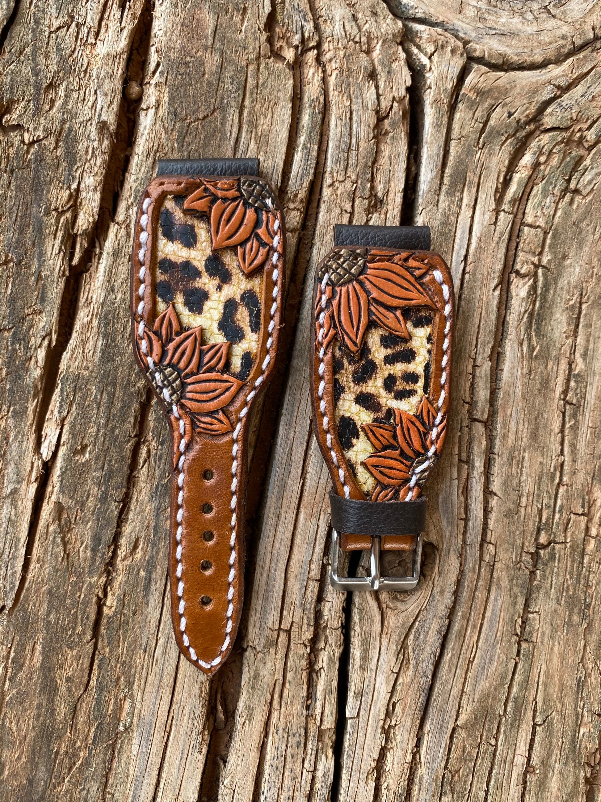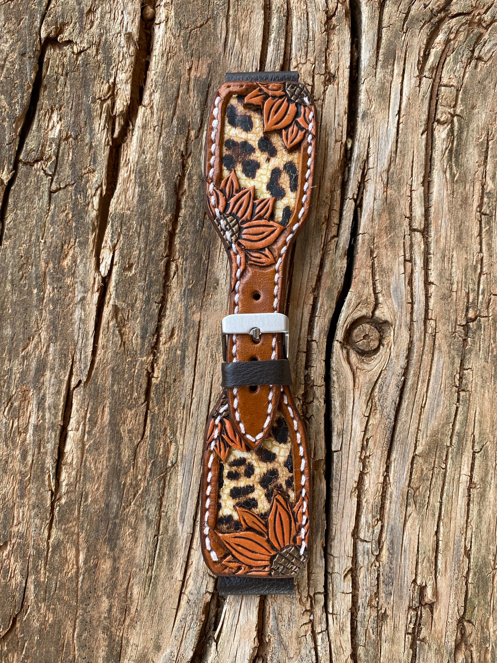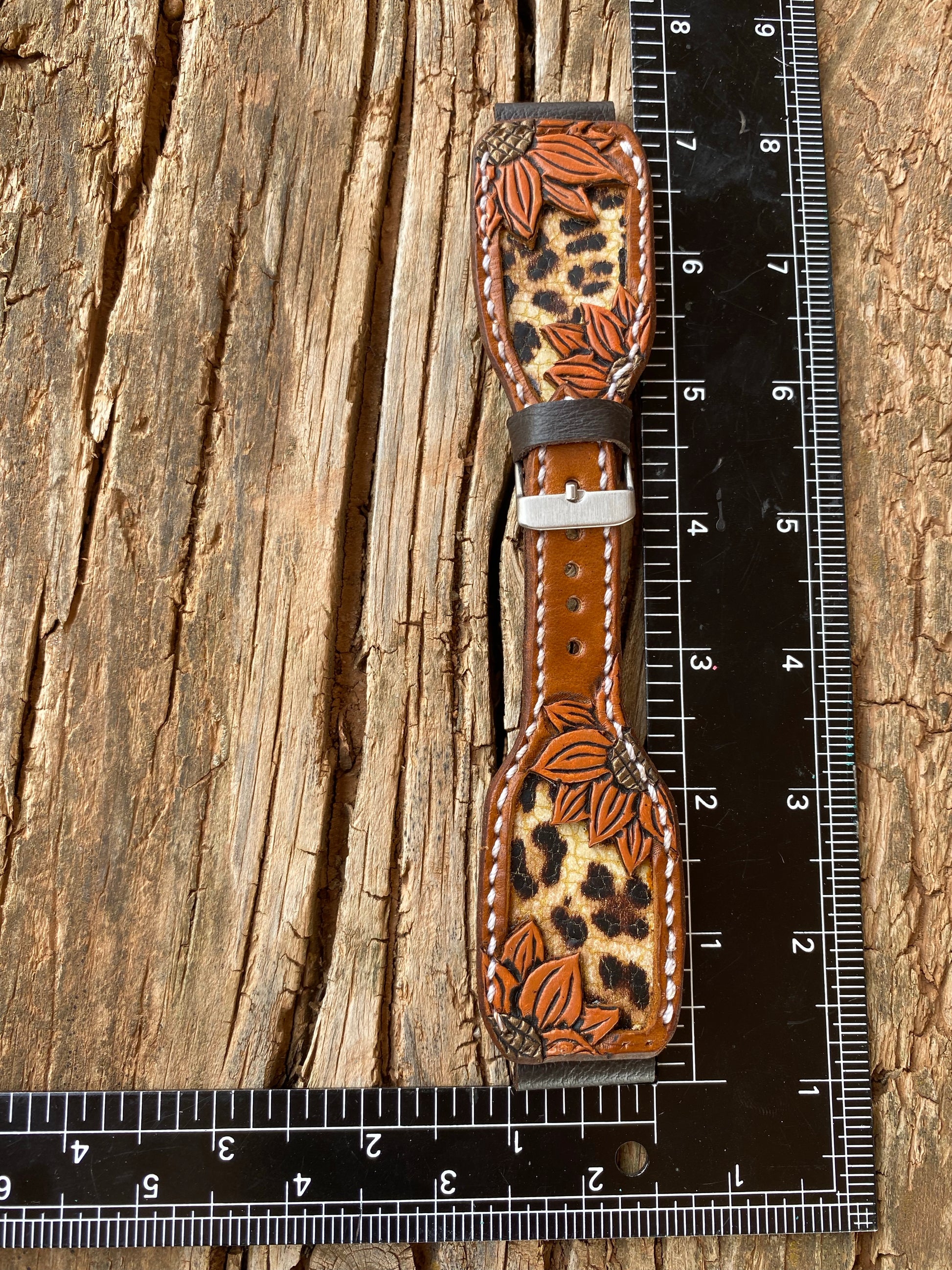 Wide leather watchband featuring tooled orange sunflowers with leopard inlay.